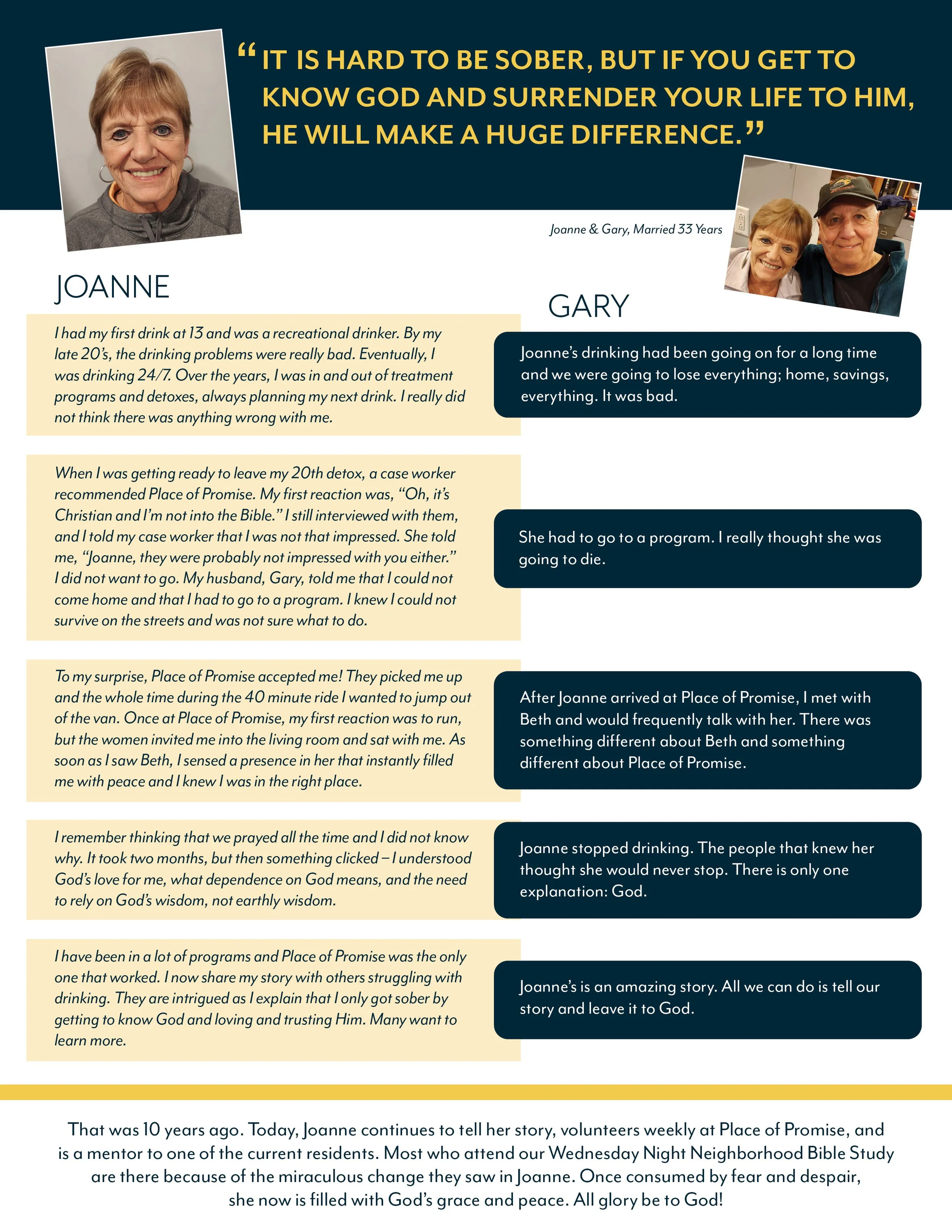YEAR-END 2021 NEWSLETTER Nov 19 Written By rory emrich Joanne and her husband, Gary, tell Joanne's story of coming to Place of Promise. Beth provides a year-end message and update. rory emrich